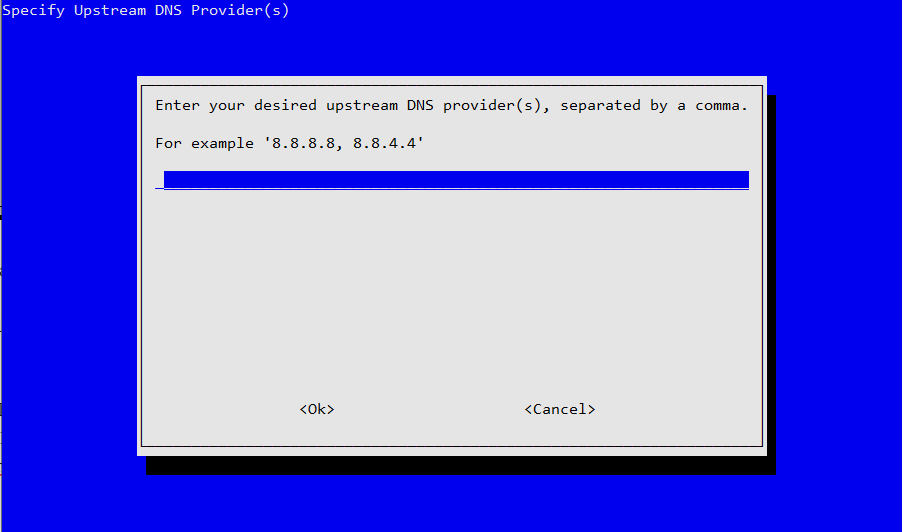 Vervolgens zal er gevraag worden om een DNS provider te kiezen. Deze wordt door Pi-hole gebruikt om de DNS verzoeken naar toe te sturen. Dit kan een standaard provider zijn, zoals Google. Ik heb een verbinding via Ziggo, dus heb ik gekozen voor de optie “Custom” om mijn eigen DNS servers in te kunnen geven.