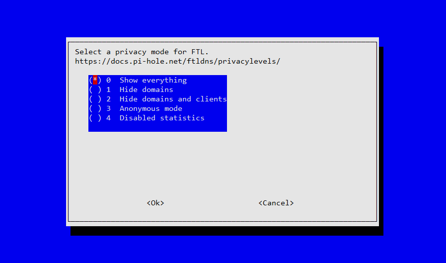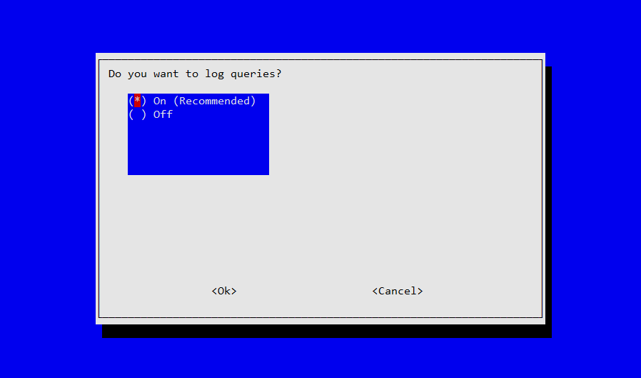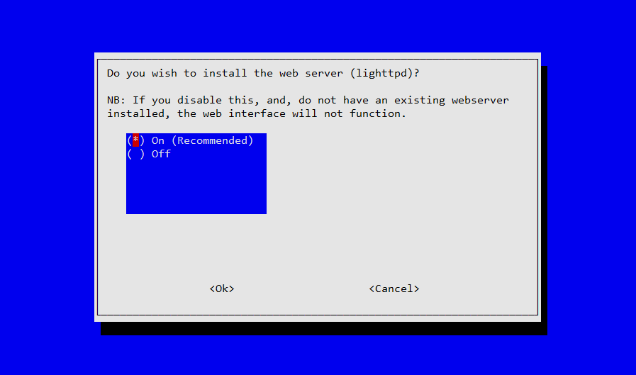 Nu komen er een aantal vragen m.b.t. de administratie interface, de lighttpd webserver, log queries en de FTL modes. Geef bij al deze opties OK (standaard selectie).