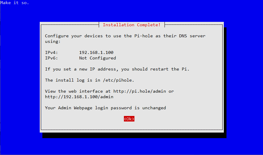Nadat de basis installatie is afgerond, kan je inloggen op de “Admin Webinterface” om Pi-hole verder te configureren.
