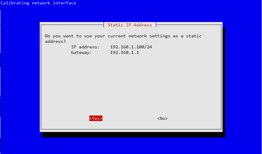 Vervolgens krijg je de vraag of je een vast IP adres wilt gebruiken, zoals eerder in deze instructie al beschreven. Zorg ervoor dat je het juiste IP adres en de juiste Gateway gekozen hebt (de Gateway is vaak het vaste IP adres van je router).